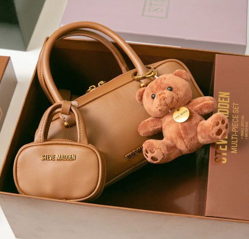 「素面法棍小包三件禮盒組」以今年席捲時尚圈的復古法棍包為主體,搭配迷你小包與療癒絨毛小熊吊飾,推出咖啡、白、粉、黑、紫五色,展現俐落又不失可愛的冬季魅力;秋冬溫柔色調的「LOGO兩寬帶兩用包/潮流徽章毛帽禮盒」內含手提與肩背皆宜的托特包、時尚毛帽與多款琺瑯別針,可依個人穿搭自由組合,米色、墨綠與咖啡三色皆帶有高級日常感,無論送禮或自用都能瞬間提升節慶儀式;另款「潮流小熊雙吊飾/素面兩用包禮盒」則提供咖啡、酒紅與黑三色選擇,包款選用細膩皮革與金屬配件點綴,搭配俏皮的小熊吊飾與墨鏡細節,是外型與實用性兼備的節日送禮首選。