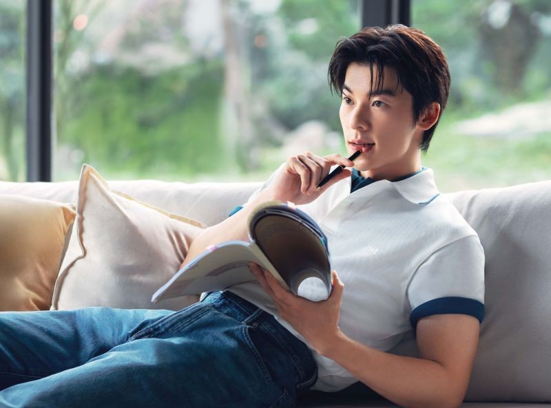 室內靜謐空間中,許光漢以白色UNIQLO and JW ANDERSON聯名「DRY網眼POLO衫」內層疊搭藍色「AIRism棉質網眼POLO衫」,傳遞夏日清新風貌,並透過色彩疊穿打造層次感,讓經典 Polo 穿法展現嶄新風貌。下身搭配「寬版牛仔褲」,寬鬆比例與俐落上身形成鮮明對比,一穿更顯高!不僅凸顯褲裝的份量感,也讓整體輪廓線條更具新鮮感!